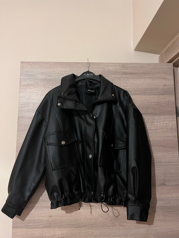 Bu siyah deri ceket, düğmeli ve kısa boyda, kesik yaka ve bantlı kollara sahip bol kesimdir. Günlük sokak stili için uygundur.