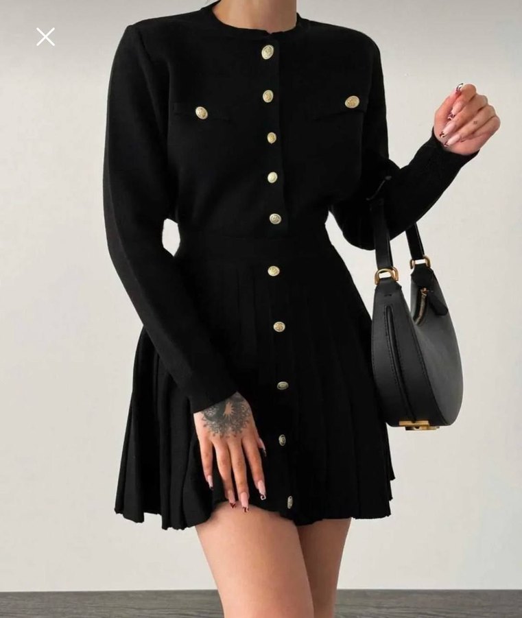 Düğmeli, uzun kollu, siyah mini deri elbise. Klasik gotik tarzda, kesimi vücuda oturan, yakası çıtçıtlı ve desensiz.Triko Etekli Takım Bedenler Standart esnek Seri 4 Adet Kod: 1072