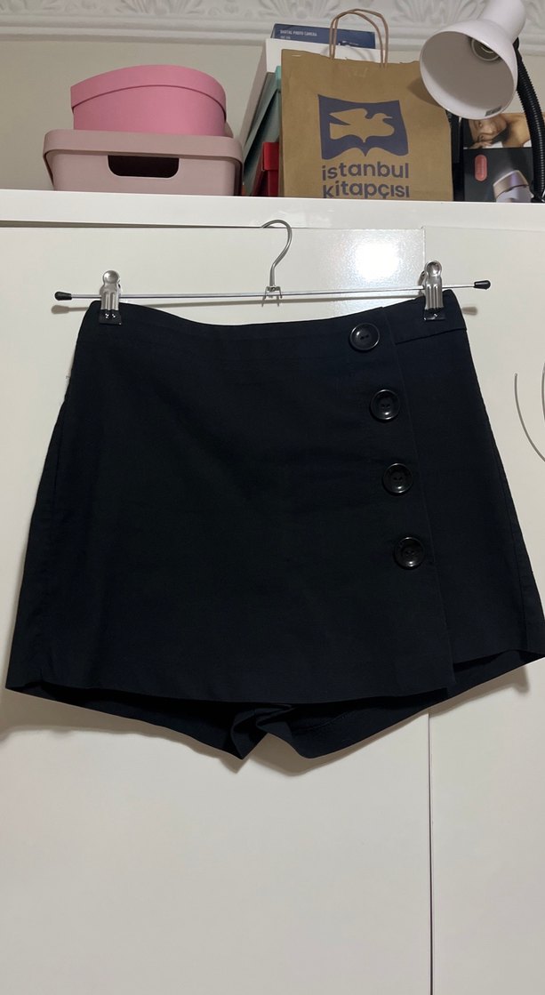Pamuk kumaştan yapılmış, düğmeli siyah mini etek. Günlük kullanıma uygun, cesur gotik tarzı yansıtır. Uzun zaman kullandım o yüzden tülermeleri mevcut. Arka fermuar kısmı yırtılmıştı, diktim