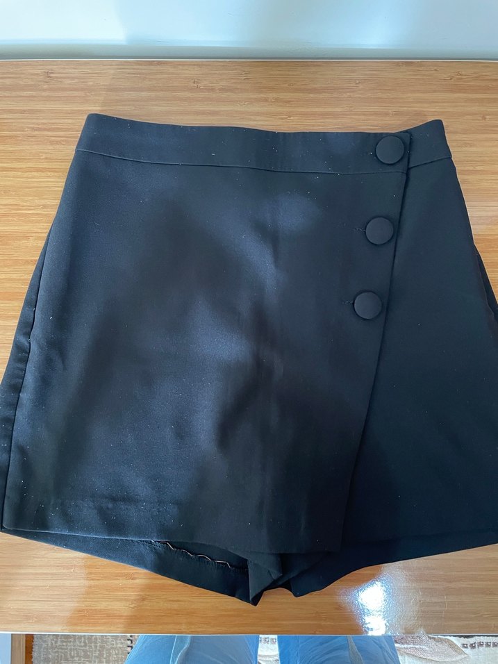 Düğmeli ön detaylı, siyah renkli ve vücuda oturan mini etek. Düz ve iş stiline uygun, günlük kullanıma elverişli sentetik kumaştan.