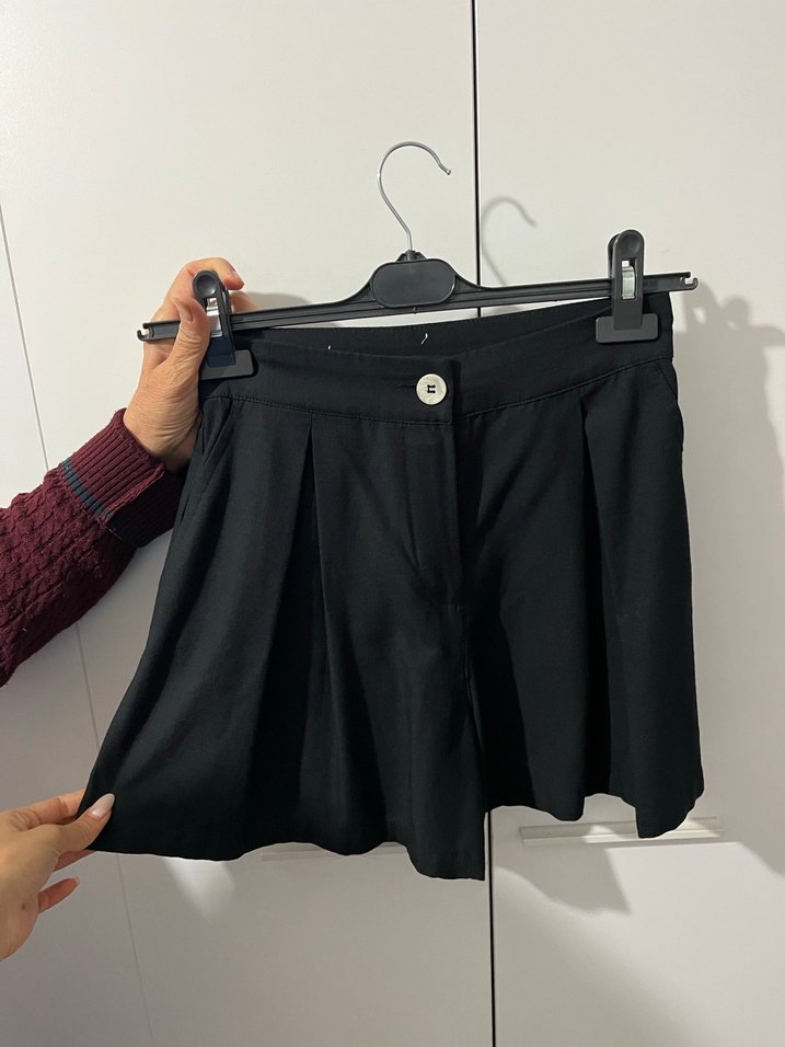 Düğmeli, siyah renkli, sentetik kumaştan yapılmış, bol kesim mini etek, günlük rahat sokak stili için uygundur.