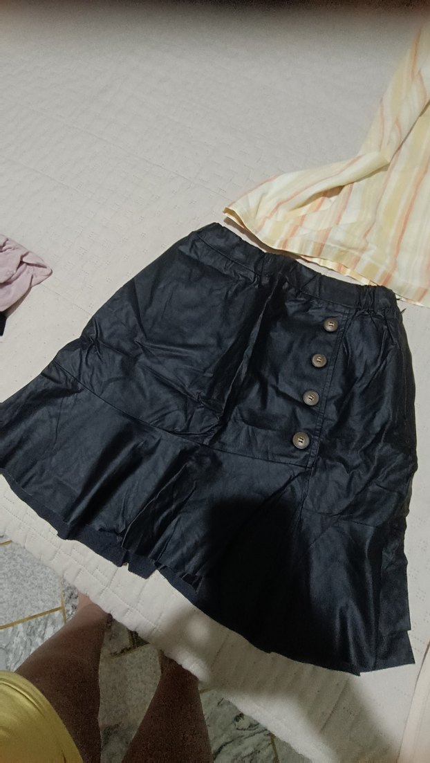 Düğmeli ön kısmı ve bol kesimi ile siyah mini etek, sentetik kumaştan yapılmıştır ve günlük kullanıma uygundur. suni deri ince
