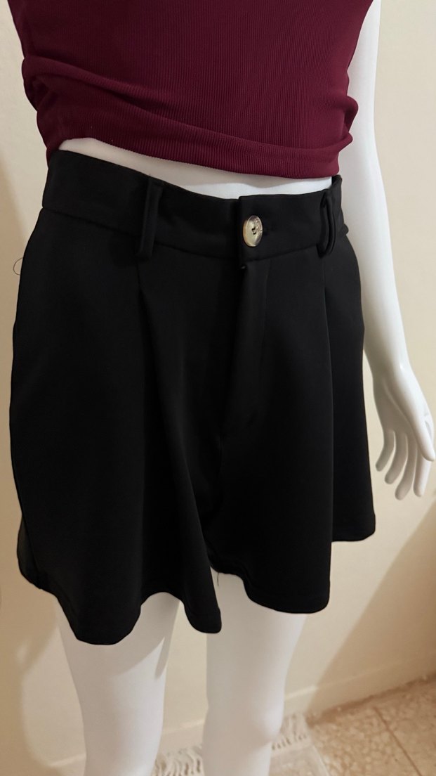 Sentetik kumaştan yapılmış, düğmeli ve bol kesim siyah mini şort. Desensiz yüzeyi günlük kullanıma uygundur. Yüzde yüz pamuk kumaş çok rahat bayıldımmm