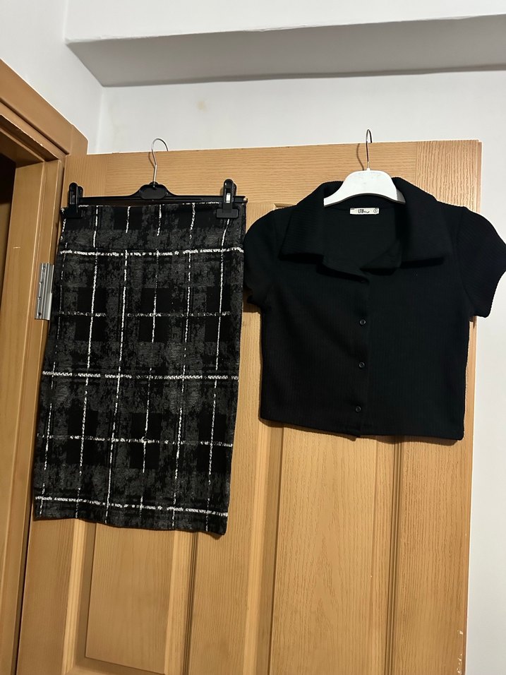 Düğmeli Siyah Mini Gömlek ve Ekose Kalem Etek