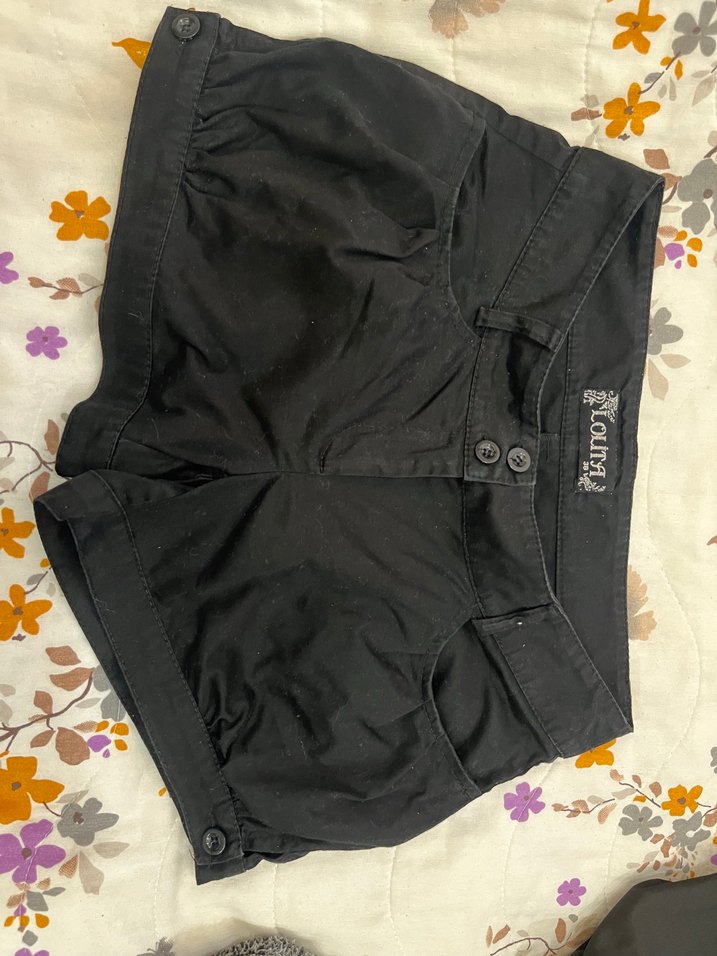 Düğmeli detaylara sahip siyah mini hamile şortu, bol kesim ve sentetik kumaştan. Rahat ve gotik tarzda günlük dış mekan kullanımı için uygun.