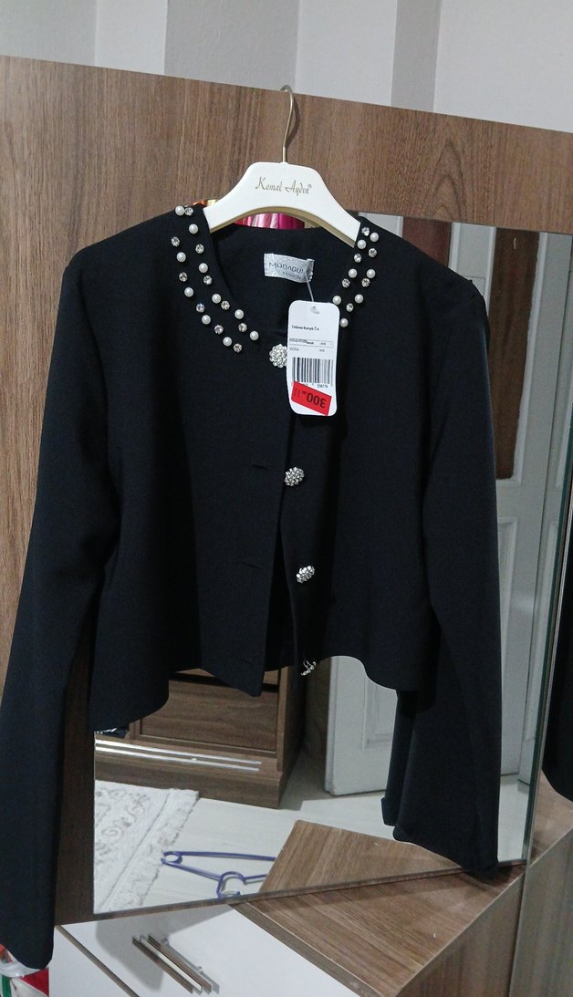 Düğmeli, kısa kesim, siyah kadın blazer. Yakası kesik ve uzun kolludur. Sentetik kumaştan ve baskılıdır. Ofis ve günlük kullanıma uygundur.