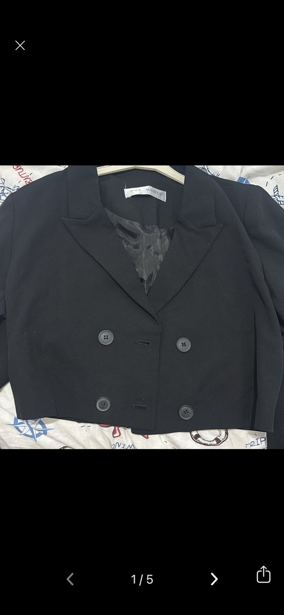 Düğmeli ön kısım ve kesikli yaka detayına sahip siyah mini blazer. Uzun kollu, regular fit ve sentetik kumaştan üretilmiştir. Ofis için uygun, trend sokak stili.