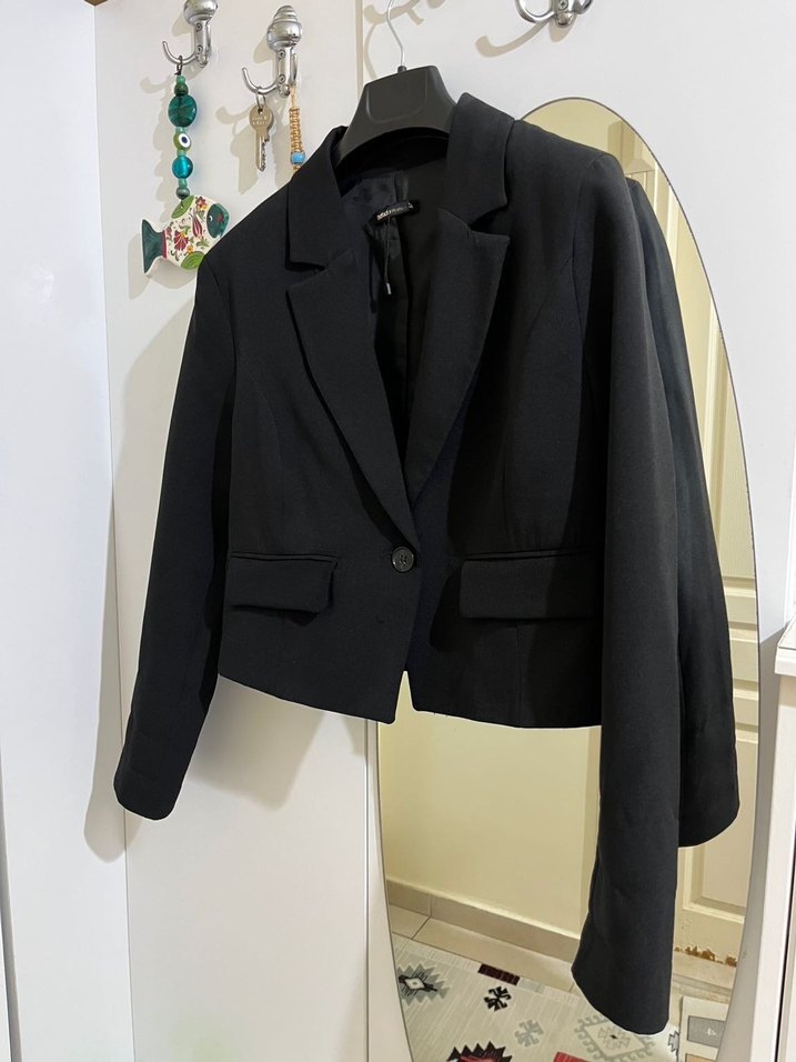 Düğmeli, uzun kollu, siyah mini blazer ceket. Regular fit, sentetik kumaştan, ofis ve sokak stiline uygun.