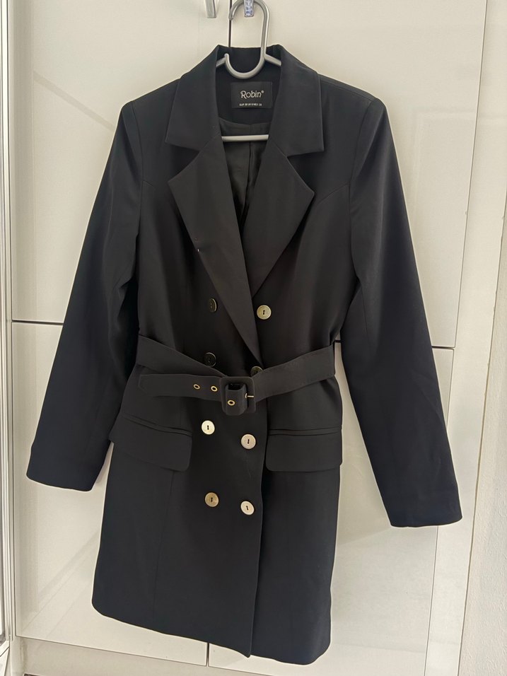 Siyah mini blazer ceket elbise, düğmeli ön ve kemer detaylıdır. Strappy kollu, normal kesim ve sentetik kumaştan üretilmiştir. Ofis için uygundur.