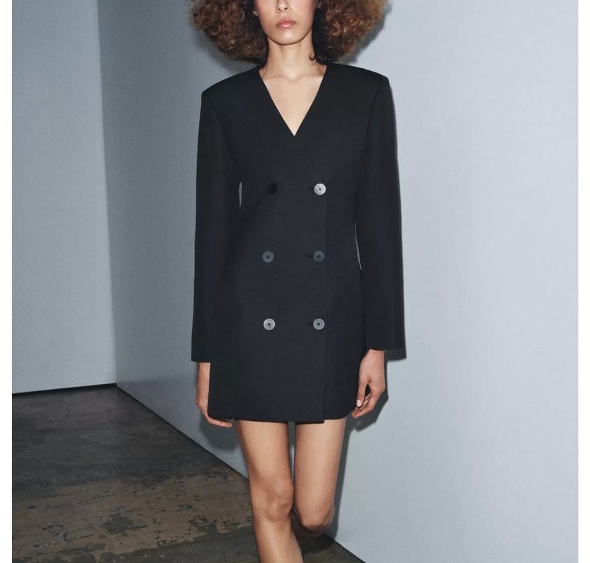 Düğmeli ön kısmı ve keskin yaka detaylı siyah mini blazer, yumuşak sentetik kumaştan üretilmiştir. Uzun kollu ve ofis için uygundur. Hiç kullanılmadı etiketli