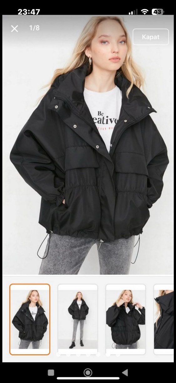 Siyah mini ceket, yüksek yakalı ve uzun kolludur. Düğmeli ve bol kesimdir, sentetik kumaştan yapılmıştır, dış mekan kullanımı için uygundur. ️