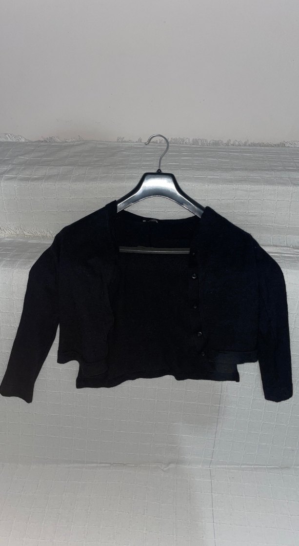 Siyah, düğmeli, uzun kollu, yuvarlak yakalı, bol kesim ve kısa uzunlukta kadın hırkası. normalde 40bedendi ama yıkanınca çekti o yüzden uygun fiyata