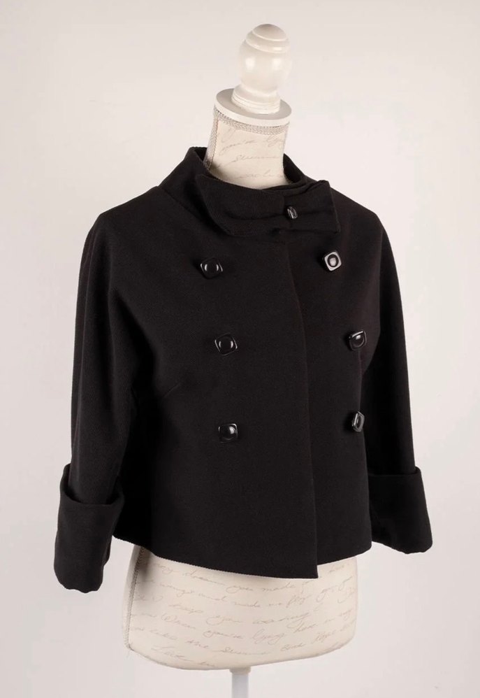 Düğmeli, kısa boy, siyah kadın ceket. Yumuşak dokulu, uzun kollu, yakası kesik ve ofis kullanımı için uygun. Hiçbir bir sorunu yok hiç giymedim