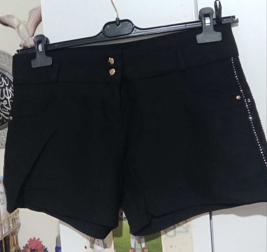 Düğmeli, siyah, vücuda oturan mini şort. Sentetik kumaştan üretilmiş, günlük kullanıma uygun cesur gotik tarzda.
