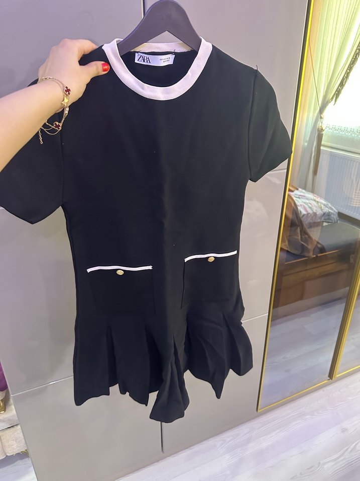 Düğmeli cepleri ve beyaz yakasıyla siyah mini tulum, kısa kollu ve dar kesimdir. Paris sokak modasına uygun, günlük kullanıma uygundur.