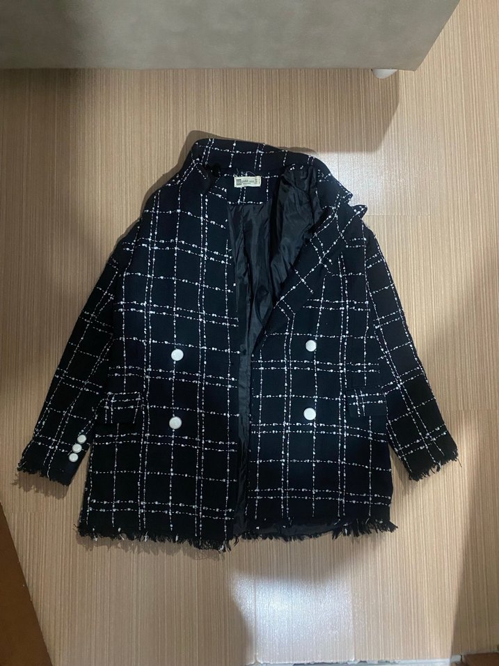 Düğmeli, siyah mini kaban, kareli desene sahip. Notlu yaka ve uzun kollu, sentetik kumaştan üretilmiş, rahat kesimli, sokak modasına uygun.