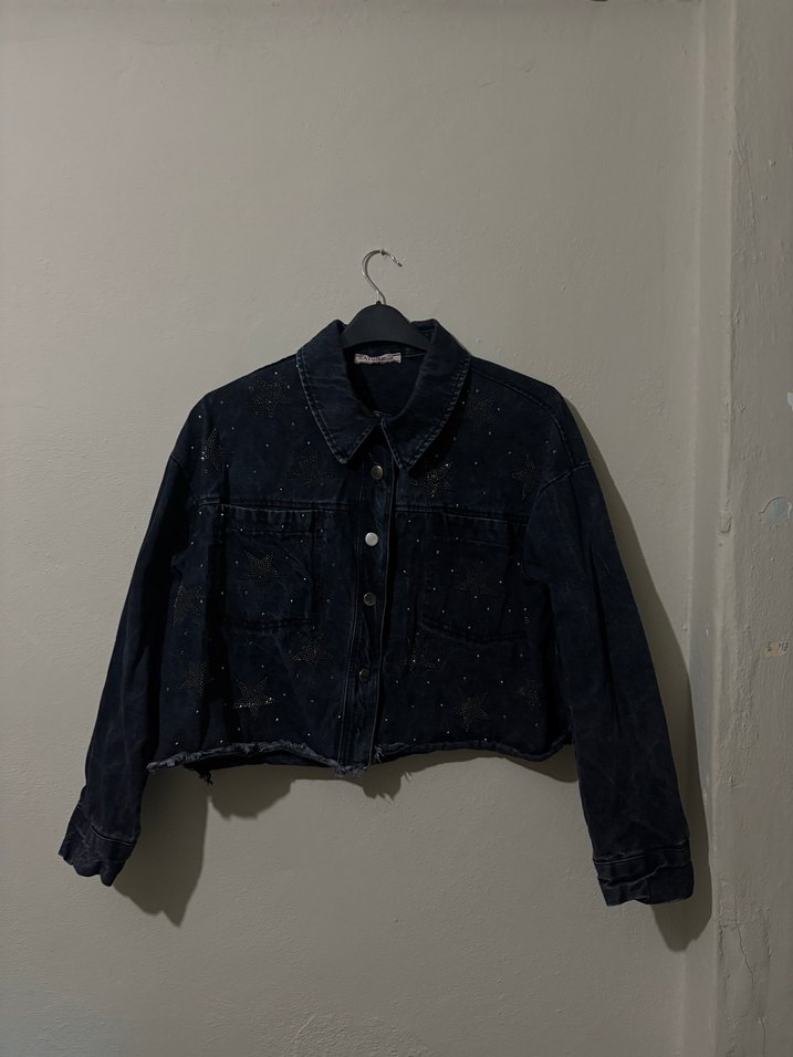 Düğmeli ön, uzun kollu, bol kesim ve kesik yakalı siyah kot ceket. Kısa boyu ve gündelik sokak stili ile her gün kullanılabilir.