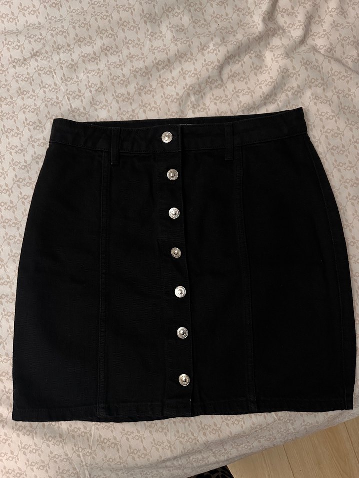 Düğmeli ön kısmı ile siyah, kot kumaş mini etek, gövdeyi saran kesimiyle gotik ve Paris tarzı sunar. Günlük kullanıma uygundur. Yepyeni sorunsuz