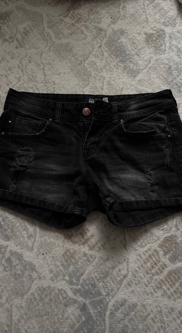 Düğmeli, siyah kot kumaştan yapılmış, mini ve vücuda oturan şort, günlük sokak tarzı için uygun.