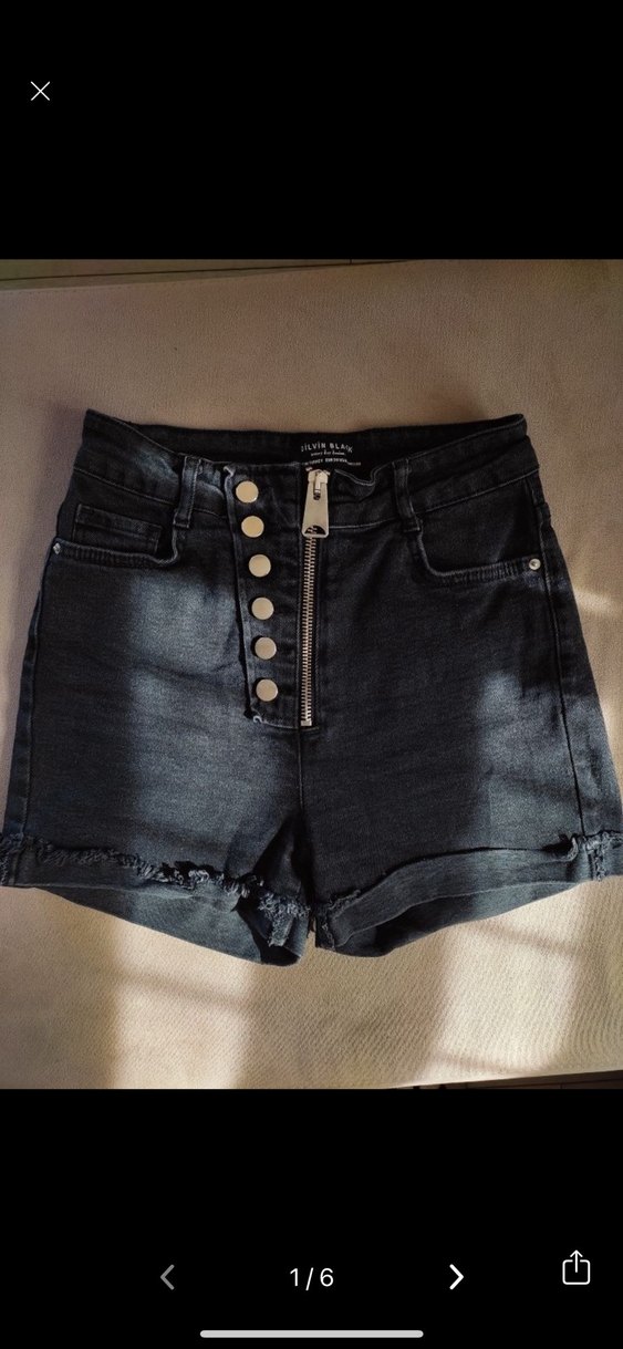 Düğmeli ve fermuarlı, hafif yıpranmış etek ucu detaylı siyah kot mini şort. Rock punk tarzına uygun, sıkı kesim ve günlük kullanım için ideal. Kilo aldığım için satıyorum