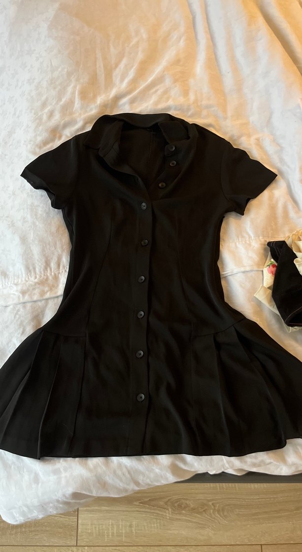 Düğmeli, kısa kollu, yakalı ve siyah renkli elbise, hiç giymedim