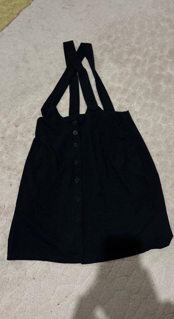 Düğmeli ön kısmı ve askıları olan siyah mini solopet. Bedeni S hiç giyilmedi bir en alttaki düğmesi kopuk. fiyatı uygun tutuyorum.