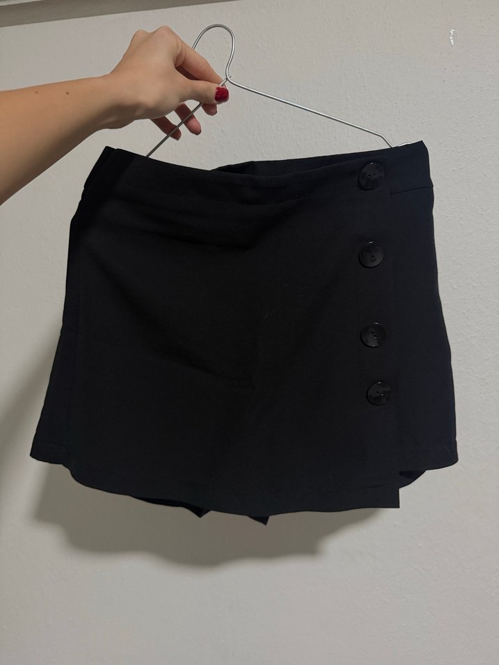 Düğmeli ön kısmı ve düz siyah renkte, sentetik kumaştan yapılmış, vücuda oturan mini şort etek.
