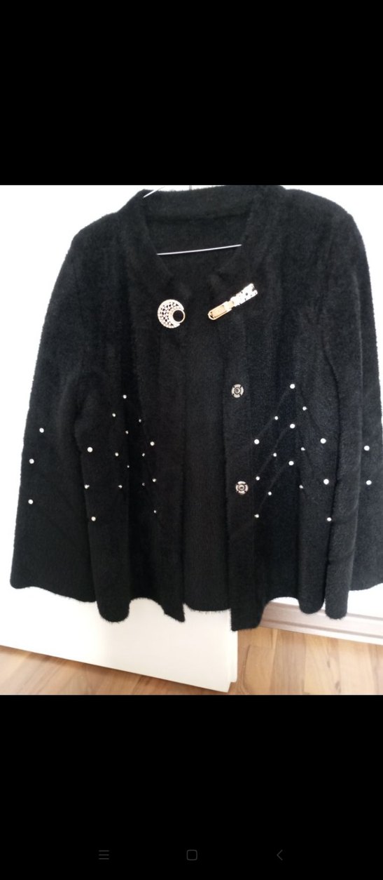 Düğmeli, siyah mini uzunlukta triko kadın kaban, uzun kollu ve kesik yakalıdır. İnci detaylarıyla süslenmiş, günlük kullanıma uygun goth ve avangard tarz sunar.