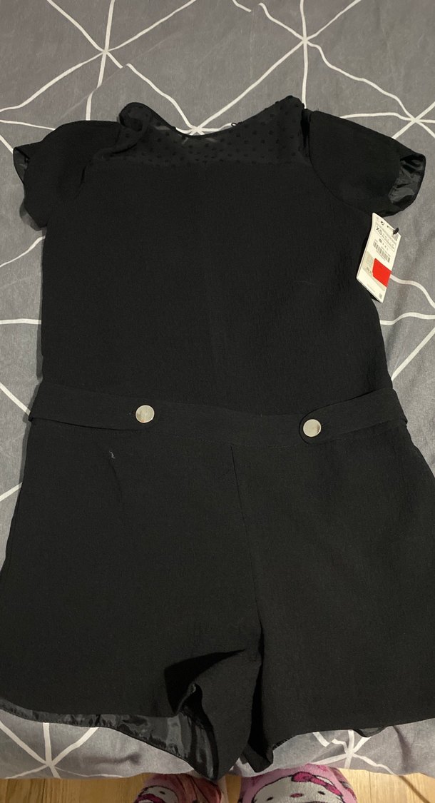Düğmeli, kısa kollu, mini siyah tulum. Notch yaka ve rahat sentetik kumaştan, ofis ve günlük kullanıma uygun.