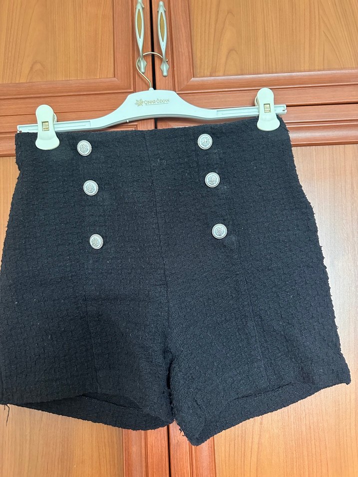 Düğmeli detaylara sahip, yün kumaştan yapılmış siyah, dar kesim mini hamile şortu. Günlük kullanım için uygun, Paris sokak modası tarzında.