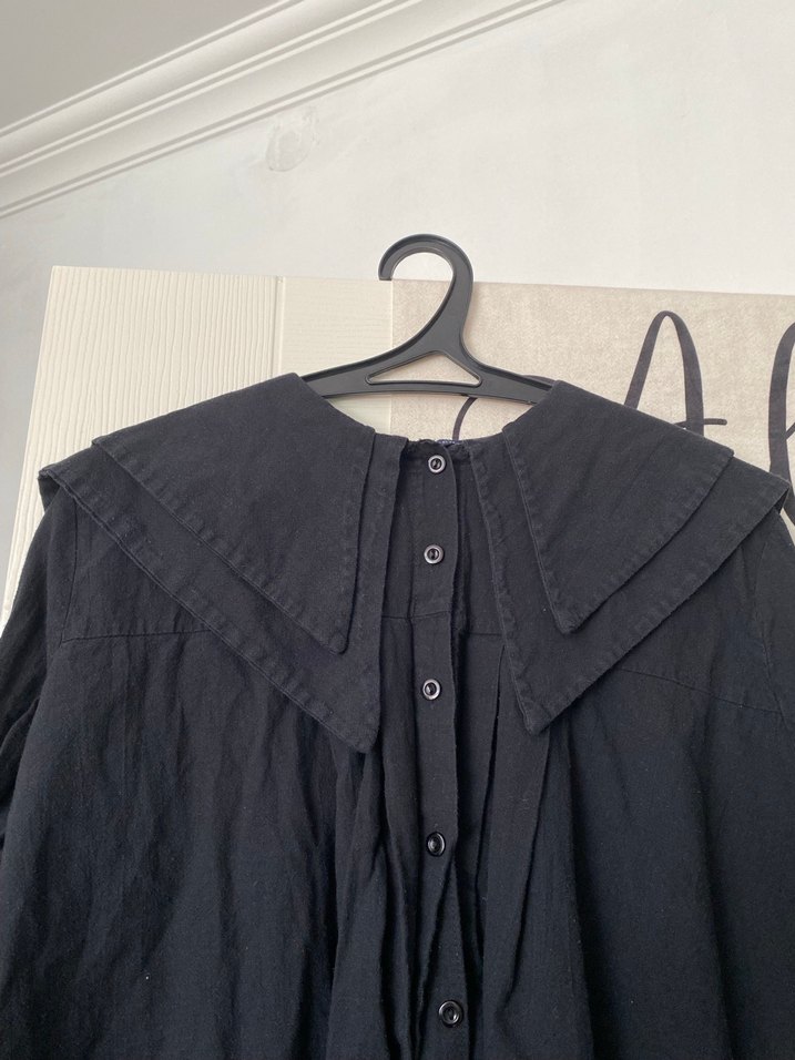 Siyah müslin bluz , yakalı ve düğmeli ön detaylıdır. Uzun kollu ve bol kesimdir, günlük kullanım için uygundur.