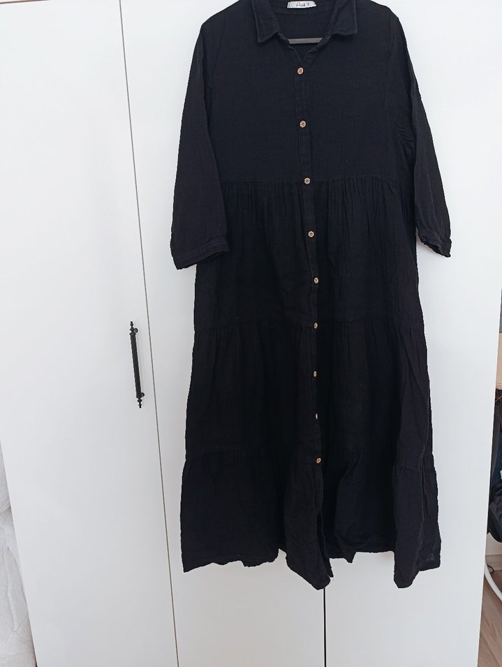 Yumuşak müslin kumaştan yapılmış, düğmeli, uzun siyah elbise. Salaş kesimi, tekne yaka ve ince askılı kollarıyla minimalist bohem tarzda.Ürün tertemiz bir kaç kere kullanıldı, hiç bir defosu sorunu yoktur Müslin kumaş çok hafif rahat asla terletmiyor #müslinelbise