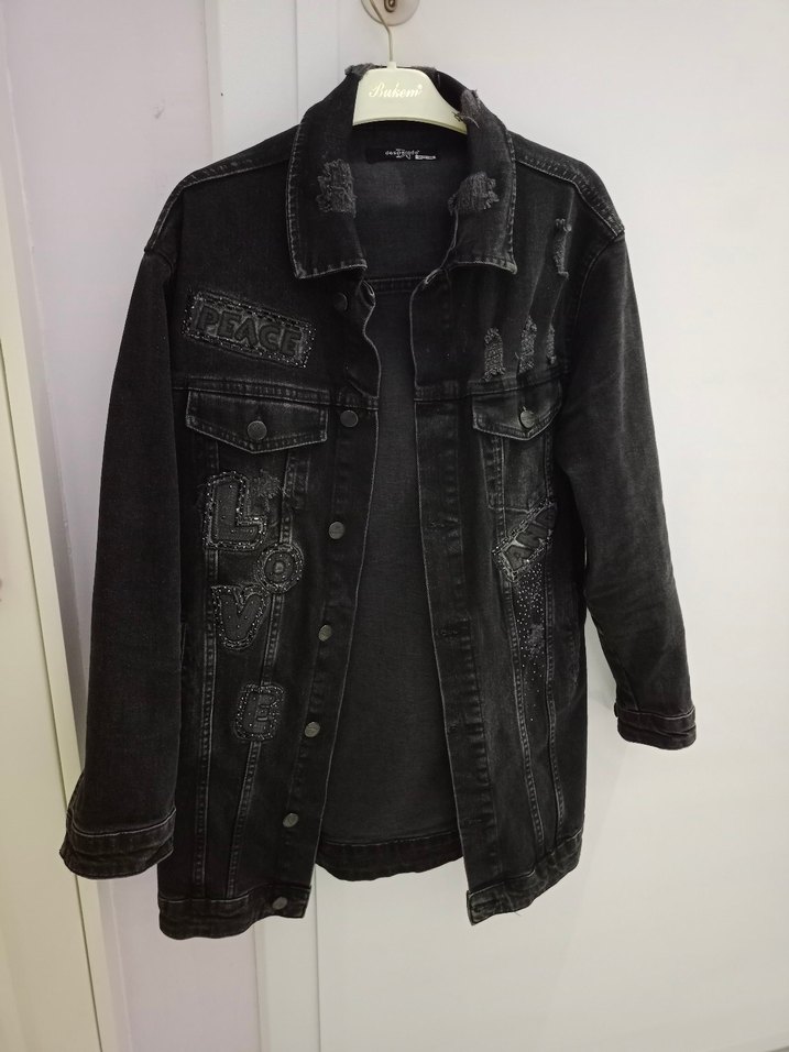 Düğmeli, uzun kollu siyah denim ceket, nakış detaylarıyla rahat ve salaş bir görünüme sahip. Midi boyda, günlük kullanım için uygun. Çok şık ve yeni etiketli ürün