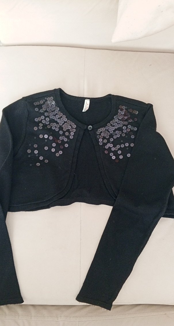Uzun kollu, düğmeli, işlemeli payet detaylı siyah, vücuda oturan örme kız hırkası.