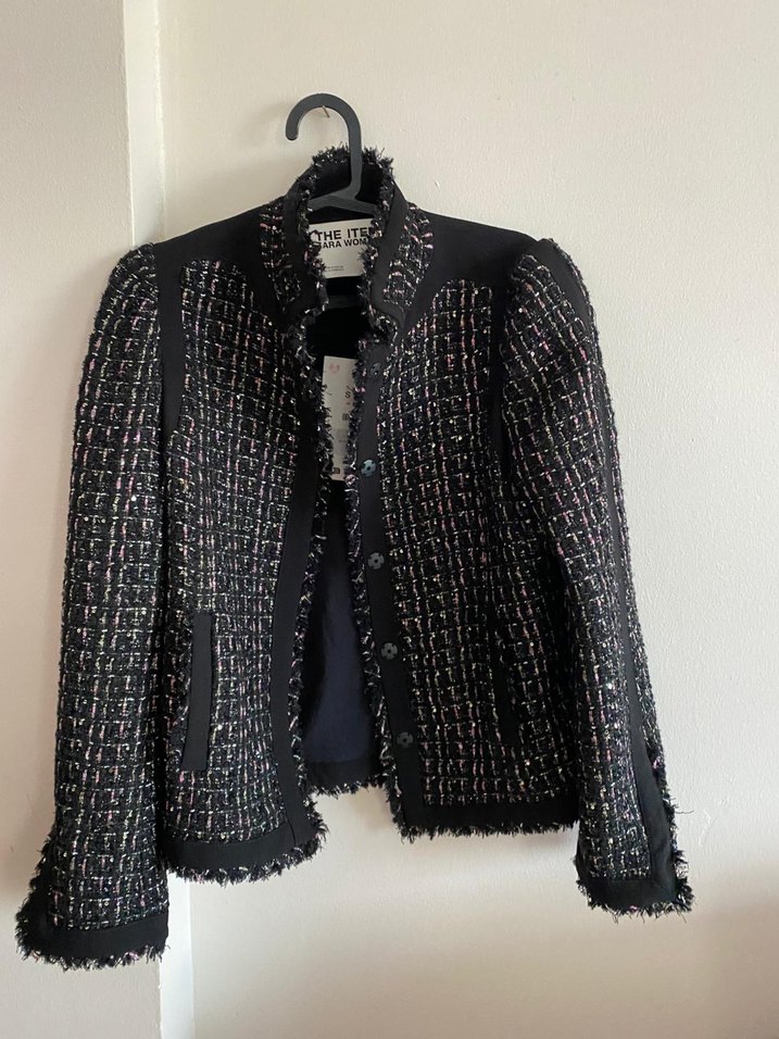 Düğmeli, siyah nakışlı midi uzunlukta kadın cekettir. Notched lapel yakalı ve uzun kolludur, ofis için uygundur.