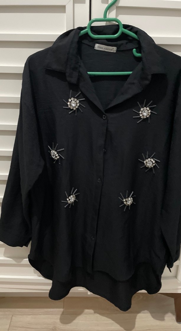 Suni kumaştan, düğmeli, uzun kollu, yakalı ve nakışlı detaylara sahip siyah bol kesim gömlek. Günlük kullanıma uygun.