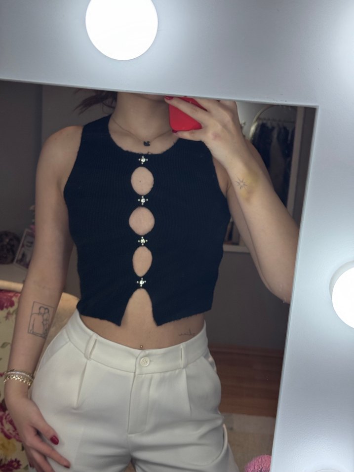 Düğmeli ön kesim detaylı, ince örme kumaştan, siyah ve kolsuz, dar kesim crop top. Defosuz xs/s beden