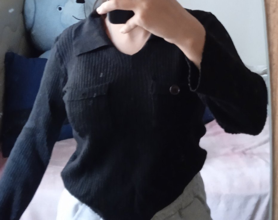 Düğmeli, uzun kollu, yakalı siyah örme kazak. Orta boyda, düz ve fit kesimiyle gündelik rahatlığa uygun, gotik tarzda şık bir parça.