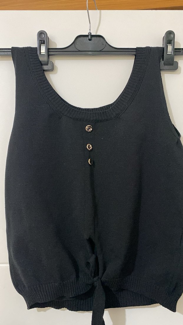Siyah örme, düğmeli, yuvarlak yaka, kolsuz kadın atlet. Salaş kesim ve normal midi boyda, günlük sokak stili için uygundur.