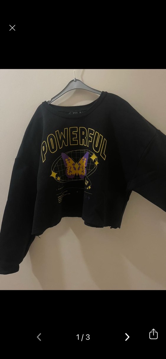 Uzun kollu, düğmeli siyah sweatshirt, bol kesim ve baskılı kelebek detayına sahip. Sokak stili için uygun.