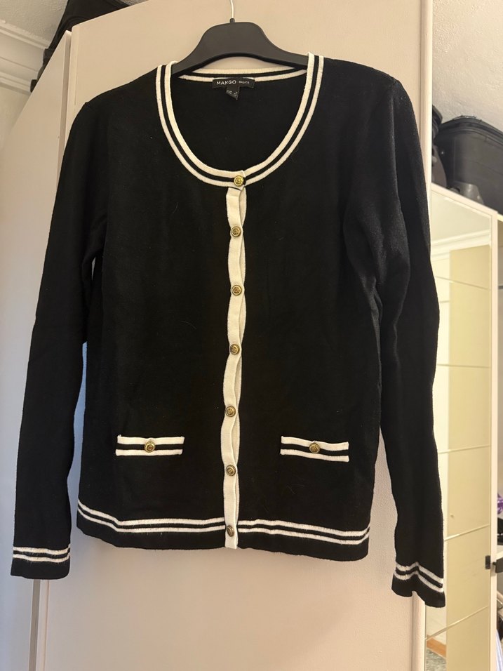 Fitted kesim, uzun kollu, bisiklet yaka ve düğmeli bu siyah pamuklu kadın hırka, beyaz şerit detaylara sahiptir. Modern klasik tarzda, günlük kullanıma uygundur.