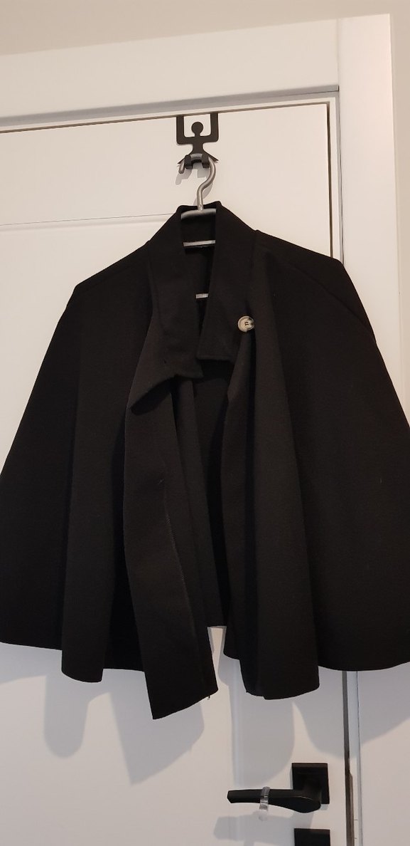 Düğmeli, yakalı siyah midi uzunlukta panço. Regular fit ve uzun kollu, yumuşak ve sıcak kumaştan. Kolye hediye ️