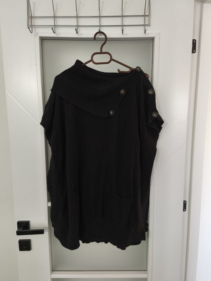 Düğmeli, yüksek yakalı, kolsuz siyah panço . Keten kumaştan, bol kesim ve günlük kullanıma uygun gotik tarzda. SML uyumlu