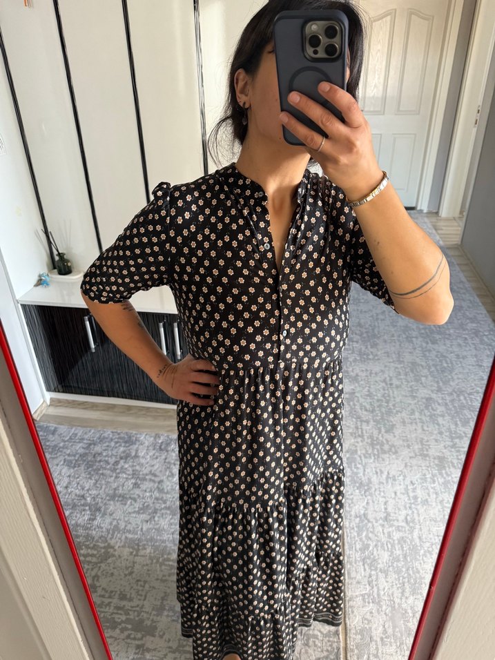 Siyah papatlayı midi elbise, düğmeli ve V yaka. Kısa kollu, bol kesim, günlük kullanıma uygun. Esnek kumaşı 40 42 44 bedene olur