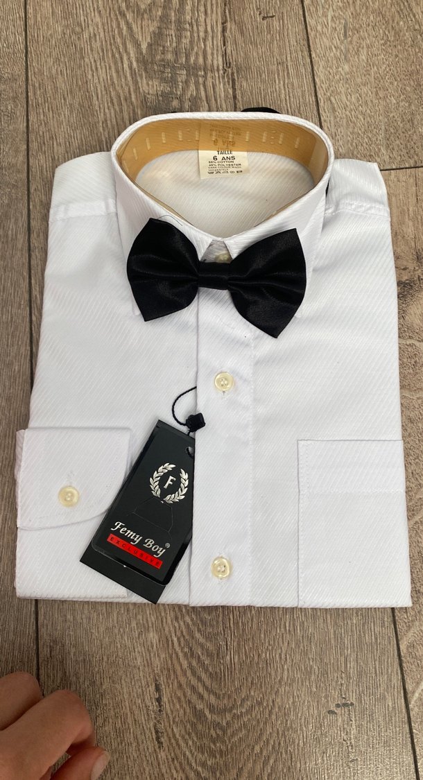 Düğmeli beyaz çocuk gömleği, sentetik kumaştan yapılmış siyah, desensiz papyon ile birlikte gelir, klasik ve sokak stiline uygun. Uzun kollu ve ceplidir. #erkekçocukgömlek