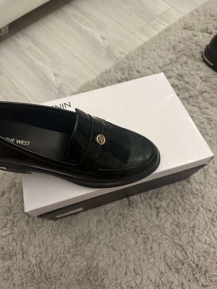 Siyah parlak yüzeye sahip, düğmeli ve blok topuklu kadın loaferları, ofis için klasik ve şık bir görünüm sunar.