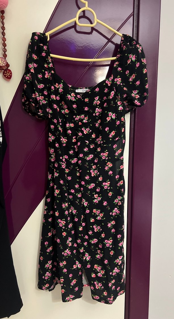 Düğmeli ön kısmı, V yaka ve kısa kollu, koyu renkli pembe çiçek desenli, vücuda oturan midi elbisedir.