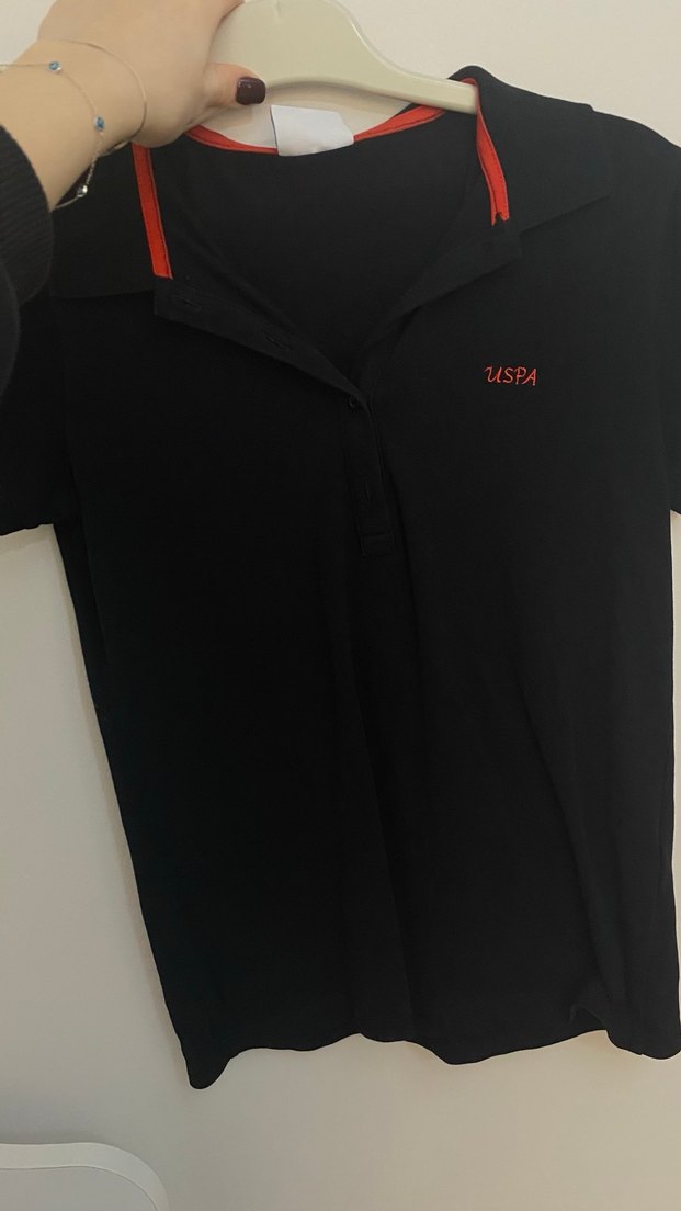 Düğmeli, V yakalı, kısa kollu siyah erkek polo tişört. Sentetik kumaştan, baskılı 'USPA' logosu ile günlük sokak stili için uygun.