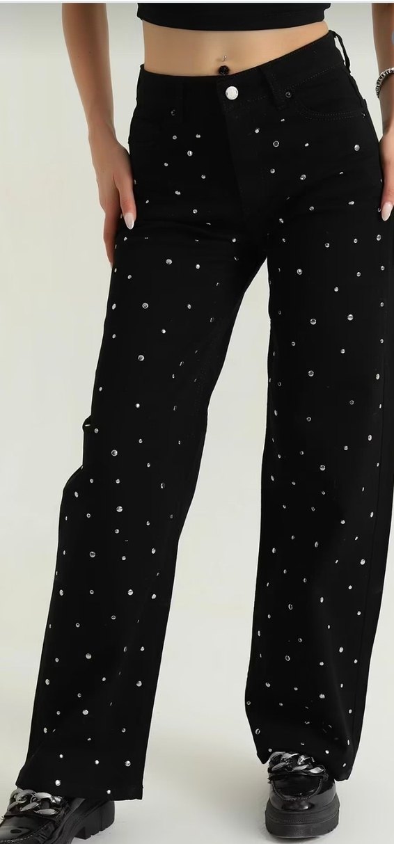 Düğmeli Siyah Puantiyeli Kadın Kot Pantolon