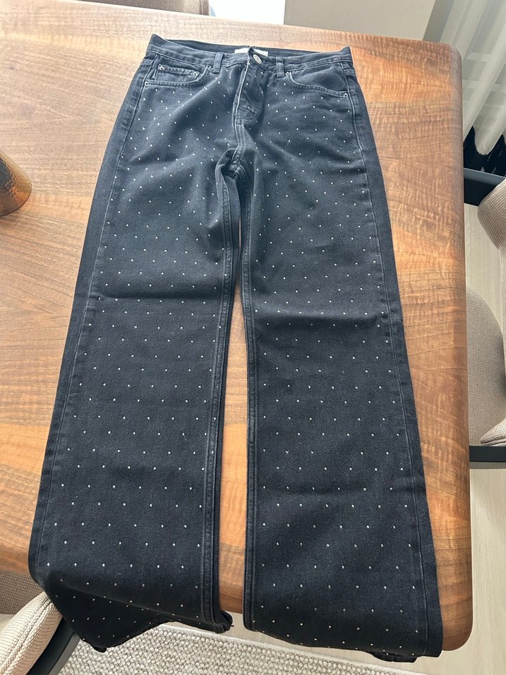 Düğmeli siyah kot pantolon, normal boy ve regular fit. İnce puantiyeli deseniyle gündelik kullanıma uygun.